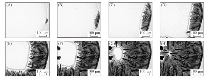 當(dāng)液滴中NaCl含量較高時(shí),鹽并不是在液滴的邊緣析出,而是在靠近邊緣的位置析出。這可能是液滴蒸發(fā)初期毛細(xì)補(bǔ)償流與Marangoni對(duì)流的競(jìng)爭(zhēng)使得溶質(zhì)在近邊緣位置富集所致。此時(shí),液滴邊緣已成為凝膠區(qū)(表面張力小),而內(nèi)部仍為液態(tài)區(qū),因而析出的NaCl晶體將在內(nèi)部液相表面張力的牽引下向內(nèi)部運(yùn)動(dòng),并逐漸形成更大尺寸的塊狀鹽晶體。說明當(dāng)NaCl濃度較高時(shí),即使存在PTFE顆粒,仍有部分NaCl會(huì)按其自身生長(zhǎng)特性形成多面體結(jié)構(gòu)。而液滴邊緣凝膠區(qū)枝晶的生長(zhǎng)則與圖2相類似,呈現(xiàn)出NaCl與膠體顆粒之間復(fù)雜耦合的特點(diǎn)。