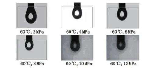 表面活性劑水溶液液滴在CO2中的形狀隨溫度變化較小,隨壓力變化關(guān)系見圖4。