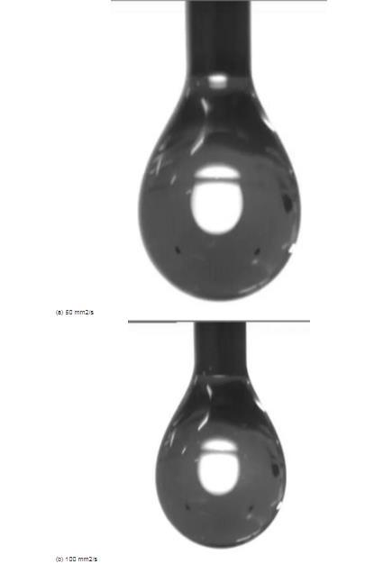 根據(jù)液滴的形成過程,實(shí)驗(yàn)選用液滴下落前的臨界懸停狀態(tài)圖像,進(jìn)一步測量了不同黏滯性硅油的表面張力系數(shù),圖4為黏度系數(shù)為50、100、350和500 mm2/s硅油樣品的懸滴形態(tài)照片。