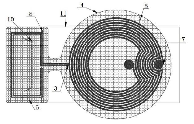 作為本發明的一種優選技術方案:若射頻芯片為具有偵測功能的射頻芯片,則由射頻芯片的射頻端口連接布設于承載基材表面的第一走線,由第一走線在承載基材其中一端的表面上構成射頻輻射結構,并且由射頻芯片的偵測端口連接布設于承載基材表面的第二走線,由第二走線在承載基材另一端的表面上構成偵測結構;