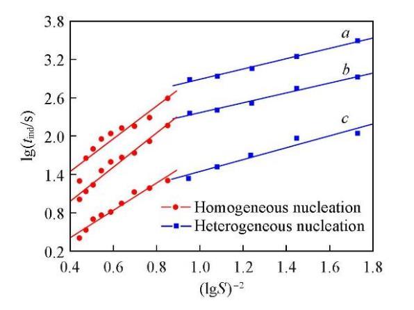 誘導(dǎo)期與初始過飽和度之間存在著很強的依賴關(guān)系.當(dāng)初始過飽和度足夠高時,成核可認(rèn)為是均相的;當(dāng)初始過飽和度足夠低時,成核則以非均相為主[37].在恒定溫度下,由晶體成核過程中的lgtind對(lgS)?2作圖可得兩條斜率不同的直線,分別對應(yīng)著兩種不同的成核機制,即初級均相成核和初級非均相成核[37].由不同溫度時Li2CO3的lgtind對(lgS)?2作圖,結(jié)果如圖3所示.可知,成核機制的變化引起了直線斜率的改變,均相成核對應(yīng)的直線斜率明顯大于非均相成核時的直線斜率(Bhom>Bhet).在較低的過飽和度時,成核以非均相成核為主;而過飽和度增大到12.13以后,成核則以均相成核為主.