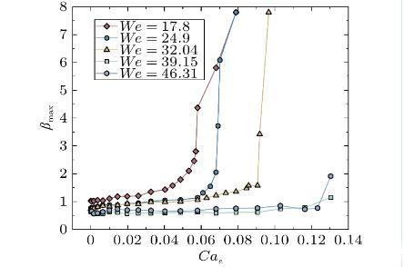 圖6描述了不同韋伯數下液滴最大無量綱拉伸系數βmax的對比趨勢。最大拉伸系數值是在式(5)的基礎上求取:βmax=Hmax/D0,其中Hmax為液滴在撞擊過程中達到的最大拉伸高度。可以發現,當實驗條件設定為低韋伯數和高電毛細數時,液滴的最大拉伸系數明顯增大,甚至在此條件下部分液滴產生了射流模態,所形成的液絲長度超出了上極板的界限。除此之外,前三組韋伯數下的液滴撞擊實驗結果分析,得到結論:韋伯數的增大,直接導致液滴達到噴射狀態所需的電毛細數相對應增大。