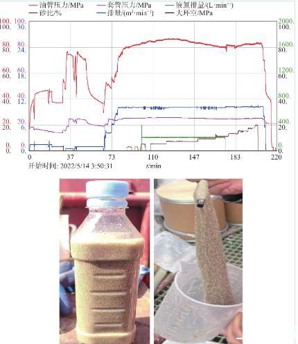 DK**-**24井斜深4461 m,地層溫度110℃左右,水平段總長度1300 m,鉆遇率84.1%,目的層馬五5段鉆遇儲層厚度25 m左右,該井設計分段18段,施工排量8~12 m3/min,采用前置酸液+高減阻強攜砂壓裂液+液氮伴注按照“先造縫、后成網”+“控黏增砂”的模式進行體積加砂壓裂施工,控制高黏液0.8%~1.0%SRY-1、中黏液0.5%~0.6%SRY-1、低黏液0.2%~0.3%SRY-1,多數段加砂施工順利,其中第4段施工排量10~10.5 m3/min,一般施工壓力79~87 MPa,最高砂比20%,壓裂液用液量1314.7 m3(其中高黏液415 m3、中黏液776.7 m3、低黏液123 m3),加砂量91.6 m3(加砂完成率101.8%),施工曲線及攜砂液靜態懸砂情況見圖8所示。