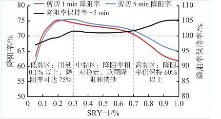 壓裂液降阻率的變化階段分別對應了壓裂液的低黏、中黏和高黏,充分了解這一變化規律,可以合理進行變黏控制以滿足壓裂施工不同階段(造縫階段、成網階段、支撐階段)對壓裂液降阻性能的特殊要求;同時,測試過程中還發現,低黏液(0.2%以內)的降阻率保持率在96%以上,而中黏液、高黏液經過5 min循環剪切后降阻率保持率超過100%,與本體系的結構流體特性(剪切稀釋性、觸變性)密切相關,這一特性也消除了深井大排量壓裂面臨的壓裂液降阻性能降低或失效的風險。