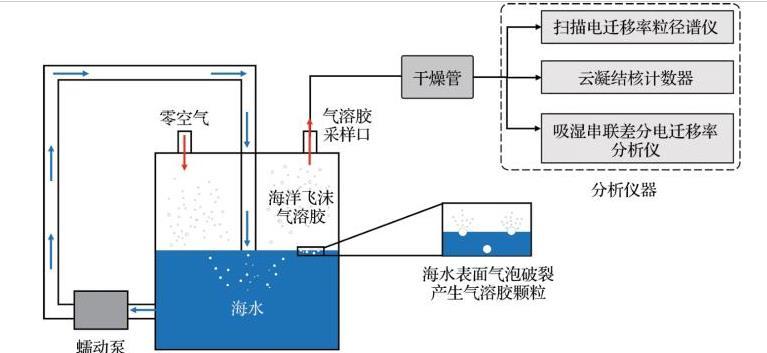 SSA生成裝置能夠在實(shí)驗(yàn)室環(huán)境中模擬自然海洋系統(tǒng),實(shí)現(xiàn)在受控條件下從天然海水中產(chǎn)生SSA,并結(jié)合儀器表征顆粒的粒徑分布和理化特性。目前常用的模擬裝置有鼓泡式發(fā)生器、射流式發(fā)生器及波浪破碎式發(fā)生器等。本文以射流式SSA發(fā)生器為例,介紹SSA的生成原理(圖2)。通常來(lái)說(shuō),發(fā)生器都具有進(jìn)水口、進(jìn)氣口和采樣口。利用蠕動(dòng)泵將海水從發(fā)生器底部周期性循環(huán)到頂部噴嘴,形成一個(gè)俯沖射流水柱,撞擊水面并將空氣夾帶進(jìn)入海水中,在水下一定深度產(chǎn)生氣泡羽流。當(dāng)氣泡上升到水氣界面并破裂時(shí),產(chǎn)生SSA顆粒。采用潔凈零空氣作為載氣,將生成的SSA顆粒通過(guò)氣溶膠采樣口進(jìn)行采集,連接干燥管進(jìn)行干燥。此后,使用掃描電遷移率粒徑譜儀測(cè)量SSA的粒徑分布和數(shù)濃度等。該裝置可連接其他儀器,如CCN計(jì)數(shù)器和吸濕串聯(lián)差分電遷移率分析儀等進(jìn)行CCN活性及吸濕性等的表征。
