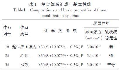 界面張力按照設定濃度分別配制超低界面張力、乳化和雙效復合體系(表1),在70°C下利用界面張力儀,測試其與目標稠油的界面張力。