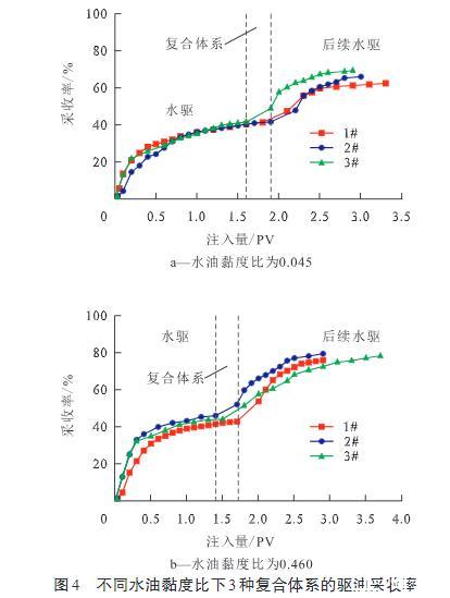 圖4不同水油黏度比下3種復合體系的驅(qū)油采收率