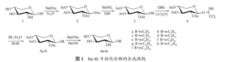 采用全乙酰化的木糖(2)在四氯化錫催化下與一系列脂肪醇發生偶聯反應,對時間要嚴格控制,否則有部分轉化成α-異構體,當時間過長時,還會形成以α-糖苷為主的產物和少量2-位脫保護的糖苷副產物。參考烷基-β-D-葡萄糖苷等合成與性能研究成果,按照Scheme1所示的路線,以D-木糖(1)為原料通過乙酰化、脫1-位乙?;?、與三氯乙腈反應,得到相應的三氯乙酰亞胺酯(4)。采用易于構筑1,2-反式糖苷鍵的三氯乙酰亞胺酯法,以三氟化硼乙醚作糖苷化偶聯反應的催化劑,使得具有鄰基參與效應的三氯乙酰亞胺酯(4)與相應的脂肪醇反應及相應的脫乙?;Wo,合成一系列烷基-β-D-吡喃木糖苷,如圖1所示。本文作者對其溶解性、表面張力、乳化性能、液晶性能、熱穩定性等理化性質進行研究。