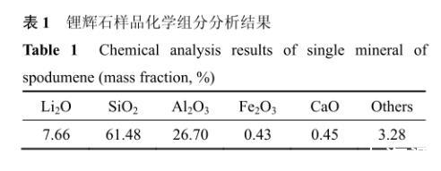 本試驗所用的鋰輝石來自四川某鋰輝石礦,試驗礦樣分別經過手選、剛玉破碎機破碎、清洗、瓷球罐研磨、篩分出0.038~0.074 mm和<0.038 mm兩個粒級的鋰輝石分別作為分析測試和單礦物浮選試驗的樣品,其化學組成分析(XRF)結果如表1所列。