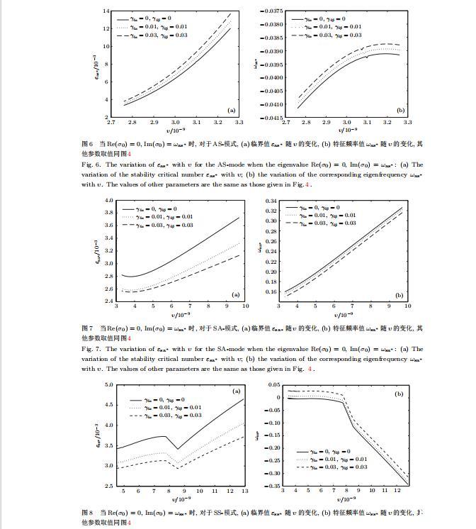 給定生長條件,令量子化條件(59)式、(64)式、(69)式和(74)式中Re(σ0)=0,Im(σ0)=ω?=0,用數(shù)值的方法計算AA-,AS-,SA-和SS-模式對應(yīng)的穩(wěn)定臨界值εaa?,εas?,εsa?和εss?.這四種振蕩不穩(wěn)定模式導(dǎo)致了所謂的全局不穩(wěn)定性機理,圖5—圖8給出了四種震蕩不穩(wěn)定模式的穩(wěn)定臨界值εaa?,εas?,εsa?和εss?隨著υ的變化圖.從圖5、圖7和圖8可以看出,隨著各向異性表面張力系數(shù)增大,穩(wěn)定臨界值εaa?,εsa?和εss?隨之減小.這就意味著各向異性表面張力減小片層共晶生長的穩(wěn)定性區(qū)域,增強了AA-,SA-和SS-這三種全局震蕩模式的全局不穩(wěn)定性;然而,對于AS-全局震蕩模式而言,從圖6可以看出,隨著各向異性表面張力系數(shù)增大,穩(wěn)定臨界值εas?隨之增大.這就意味著,各向異性表面張力增大片層共晶生長的穩(wěn)定性區(qū)域,減弱了AS-全局震蕩模式的全局不穩(wěn)定性.
