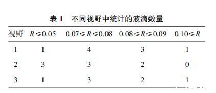 實驗三探究影響最終液滴大小的參數,這里以75%乙醇濃度為例,說明測量碎裂液滴大小的方法。觀察多個視野,將視野內的液滴劃分為四類,顯微鏡下觀察到的液滴通過三點共圓確定液滴半徑,并測出各自半徑R(單位mm)隨機選取中部3個面積相同(A=πr2=2 mm2)的典型視野,統計各個視野中不同大小的液滴數量。最終加權求平均得到R平均=0.0743 mm=74.3μm.