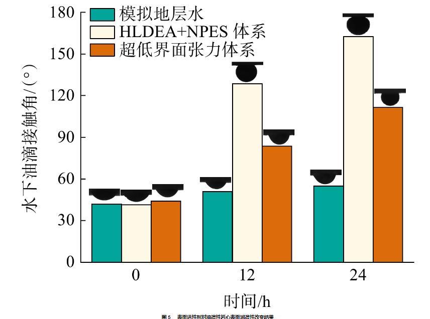 通過評價(jià)表面活性劑體系在親油巖心表面的潤濕性來考查體系潤濕調(diào)控能力,實(shí)驗(yàn)結(jié)果如圖5所示。從圖5可知,地層水可較微弱地改變親油巖心表面潤濕性,但表面仍為親油表面。超低界面張力體系作用下,可在24 h內(nèi)將表面水下油滴接觸角由43.98°改性到111.35°。調(diào)控界面潤濕性效果最為顯著的是HLDEA+NPES體系,24 h內(nèi)水下油滴接觸角由41.34°增至162.53°,實(shí)現(xiàn)強(qiáng)親水改性。
