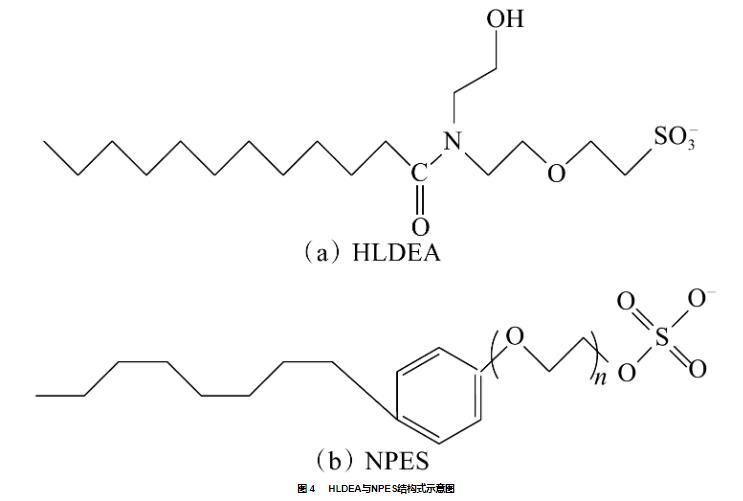 將配制好的穩(wěn)定性優(yōu)異的復(fù)配體系[0.15%(w)HLDEA+0.15%(w)助表面活性劑]置于75℃條件下,測定復(fù)配體系的油水界面張力,結(jié)果見圖3。由圖3可得,復(fù)配后體系油水界面張力隨時(shí)間均出現(xiàn)先下降后基本保持平衡的趨勢。HLDEA與兩種陰非離子型表面活性劑APEC-4Na和NPES復(fù)配后體系的油水界面張力降低至接近超低界面張力水平(10?3 mN·m?1)。這是因?yàn)镠LDEA分子小、親油性高,其擴(kuò)散速度快且傾向于進(jìn)入油滴內(nèi)部,同時(shí),溶液中的NPES分子隨時(shí)間推移逐步被吸引于油水界面,尾鏈與HLDEA分子相互糾纏形成緊密結(jié)構(gòu),提高了油水界面吸附膜的致密程度,從而使界面張力大幅降低。最終優(yōu)選出的助表面活性劑為NPES,在與HLDEA復(fù)配后體系界面張力值為3.8×10?3 mN/m。HLDEA與NPES結(jié)構(gòu)式見圖4。作為對比的超低界面張力體系油水界面張力值為2.9×10?4 mN/m,較HLDEA+NPES體系界面張力低了一個(gè)數(shù)量級。
