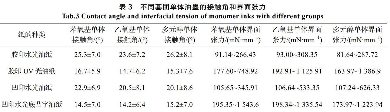 制備3種不同表面張力(26.3、24.6和25.0 mN/mm)的油墨,不同基團單體油墨的接觸角和界面張力如表3所示。