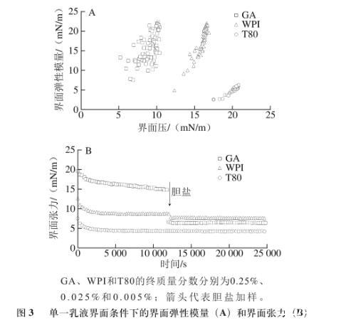 由圖3A可知,GA和WPI界面的彈性模量值基本一致,比T80界面的彈性模量值高很多。說明此質(zhì)量分?jǐn)?shù)條件下GA和WPI形成的界面相對T80有更好的界面黏彈性。這是由于大分子GA和WPI具有較強(qiáng)的空間位阻,在乳滴界面可形成較厚的吸附層,乳滴空間穩(wěn)定性較好,可在一定程度上抵御外力造成的變形。T80屬于小分子表面活性劑,在界面吸附致密整齊,但乳滴的空間穩(wěn)定性較差,易發(fā)生變形和聚集。圖3B表明,在加入膽鹽后,GA界面的界面張力降低值ΔT為8.42 mN/m,T80界面的界面張力基本不變,WPI界面的界面張力降低值ΔT為1.09 mN/m,由此證明T80的抗膽鹽取代能力最優(yōu),其次為WPI和GA。3種乳化劑所呈現(xiàn)的界面特性與3種乳液的消化動(dòng)力學(xué)規(guī)律相吻合。采用界面流變技術(shù)可有效評價(jià)乳化劑的界面特性,腸液組分對乳滴界面特性造成的影響以膽鹽取代最為顯著。因此,通過評價(jià)膽鹽在界面的取代能力,可在一定程度上判斷乳液的脂肪消化動(dòng)力學(xué)規(guī)律。