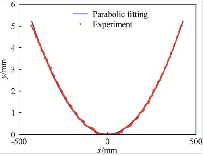 Sane等推導了表面張力系數與尼龍繩曲線方程的關系,但并未獲得曲線方程的精確解,而是采用高階多項式對實測曲線進行擬合,發現選取二階多項式可以得到較好的結果,從而也獲得了式(10),并通過擬合系數得到了表面張力系數。本文的嚴格推導說明:流道邊界曲線是拋物線加上高兩階小量的修正。圖(2)也證明了這一推導結論的正確性。
