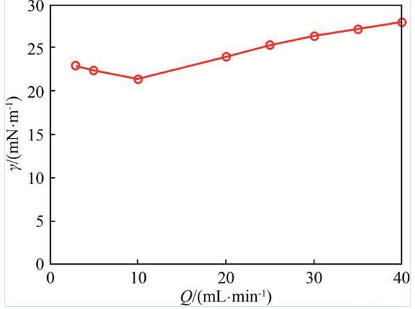 利用這一方法,還測量了表面張力系數隨皂液流量的變化關系,如圖4所示。圖中曲線并非如部分文獻報道的“表面張力系數隨皂液流量增加而單調下降”,這可能是由于表面張力系數隨皂膜厚度變化而有所變化、且實驗中皂膜厚度并非均勻分布導致的。