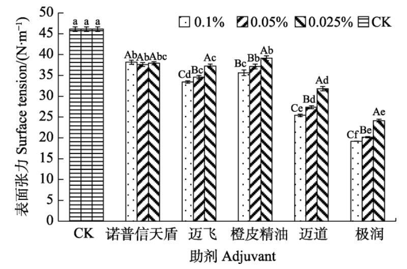 不同大寫(xiě)字母表示同種助劑不同濃度間差異顯著(P<0.05);不同小寫(xiě)字母表示同一濃度不同助劑間差異顯著(P<0.05)。