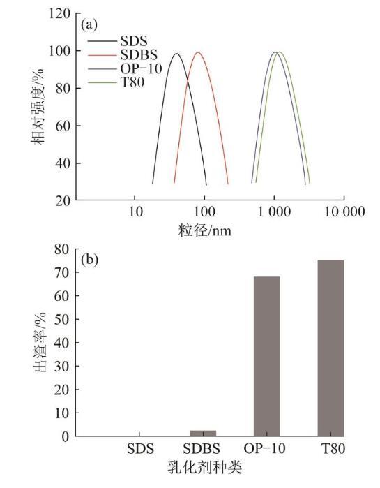 圖1乳化劑種類對產(chǎn)品粒徑中值(a)和出渣率(b)的影響
