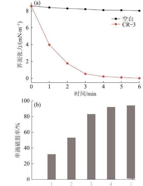 圖2界面張力(a)與單滴破裂率(b)隨時間的變化