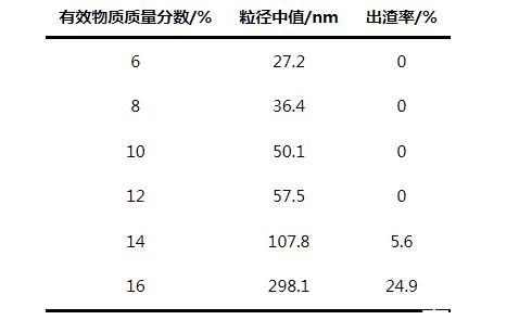 由表2可知,隨著CR-3有效含量的增加,聚合物分子粒徑中值逐漸增大,當(dāng)有效物質(zhì)質(zhì)量分?jǐn)?shù)達(dá)到14%時,粒徑中值和出渣率明顯增加。這是因?yàn)楫?dāng)膠束的大小和數(shù)量一定時,隨著反應(yīng)單體進(jìn)入膠束的數(shù)量增多,共聚后分子尺寸逐漸增大,當(dāng)聚合物分子的粒徑和數(shù)量大于膠束承受的上限時,膠束穩(wěn)定性降低,聚合物從乳液中析出形成沉淀。因較大的粒徑中值除油效果較優(yōu),綜合考慮,選擇產(chǎn)品的有效物質(zhì)質(zhì)量分?jǐn)?shù)為12%。