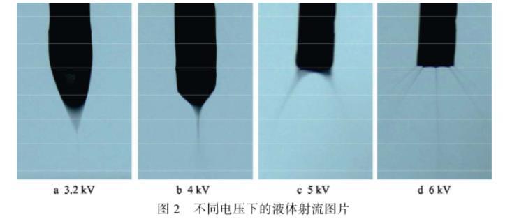 電壓越高,液體霧化成的液滴越細小。隨著電壓的升高,液滴霧化的射流狀態大致可以分為三種:滴狀模式、錐射流模式和多股射流模式。在較小的電壓(0~3 kV)下,噴嘴處液體所受的電場力小于表面張力,噴嘴中液體以滴狀形態落下,為滴狀模式。電場力逐漸增大,噴嘴液體被拉成細長軸狀,形成連續的射流。進一步增大電壓(如圖2a、b所示),液體在噴嘴處形成錐狀,且破碎成小霧滴,為錐射流模式,如圖2b所示,射流狀態最穩定。