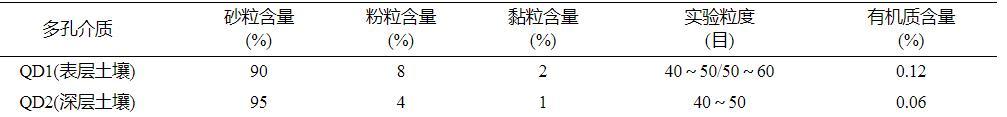 本研究選用的兩種多孔介質(zhì)分別為QD1(表層20~40cm土壤)和QD2(地下50~100cm深層土壤),均采自青島市嶗山區(qū)某農(nóng)田。經(jīng)過自然風(fēng)干后,將其篩分為40~50目和50~60目。實驗選用土壤中的金屬氧化物含量均較低,主要差異為有機(jī)質(zhì)含量。土壤樣品的性質(zhì)見表1。