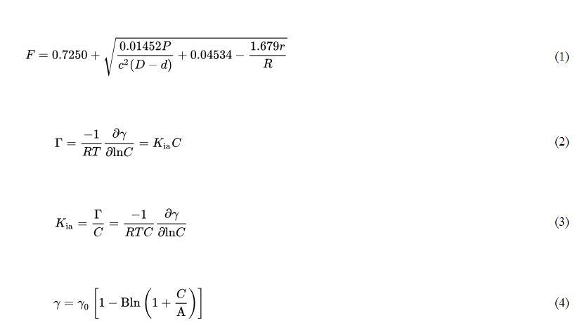實際表面張力(γ)由儀器表面張力讀數(shù)(P)、校正因子(F)和實驗相關(guān)常數(shù)相乘得到。校正因子計算如公式(1)所示;氣-水界面吸附系數(shù)通過Gibbs吸附等溫方程得到,見公式(2)和公式(3);將Szyszkowski方程應(yīng)用于表面張力數(shù)據(jù),見公式(4),該方程提供了一種計算數(shù)值的統(tǒng)一方法。