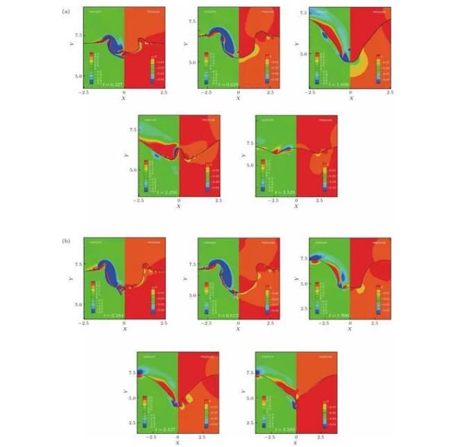 圖9不同時間節點下水滴撞擊深水液池空腔運動的渦量場和壓力場等值線圖