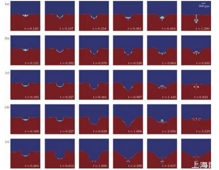 上述水滴撞擊水池的過程可以歸納為三個基本階段,第一階段為空腔的形成與膨脹;第二階段為毛細波傳播導致的空腔收縮;第三階段為空腔的回復。液滴撞擊深水液池時的運動分為完全聚結與部分聚結現象,在水滴與深水液池完全聚結時,水滴入水時由于水滴底部發生凹陷變形產生的氣泡夾帶隨著撞擊速度的增加而減小,而在部分聚結發生時氣泡的夾帶與截留行為則更為復雜。