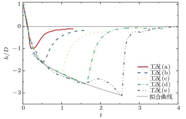 圖6為不同工況下空腔深度h隨時間的變化過程。由圖6可以看出,液滴撞擊深水液池后,由于動能、空腔側壁隆起部分重力勢能以及表面張力能的驅動,空腔深度先以較快速度增長,其后增勢逐漸放緩,在到達最大空腔深度后快速回彈,至接近原自由液面后回彈速度逐漸放緩,近乎趨于直線。弗勞德數的增加對空腔深度變化影響顯著,在工況(a)中,弗勞德數僅為117.2,空腔能量耗散時程較短,回復較為迅速,隨著弗勞德數的增大,撞擊動能增大,回復時程也逐漸增加。值得注意的是,在工況(e)中,由于空腔形狀由U形轉變為近似梯形,空腔在t=1.5—2.6時先緩慢上升,隨后毛細波向空腔底部傳遞,促使其底部變為圓柱形,且深度繼續增加,最后空腔底部側壁坍塌形成射流,因此在t=2.6后空腔回復速度較其他工況更為迅速。將數值結果運用最小二乘法擬合,得到的擬合曲線表達式如(8)式所示,該式能夠在忽略毛細波運動的前提下,在空腔深度為h=D至達到最大深度的范圍內較好地描述了空腔深度隨時間的成長關系,Liow等與Ray等對液滴撞擊運動中時間與空腔深度的關系進行了建模,得出與本文相似的結論: