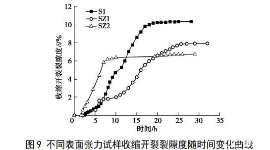 圖9不同表面張力試樣收縮開裂裂隙度隨時間變化曲線
