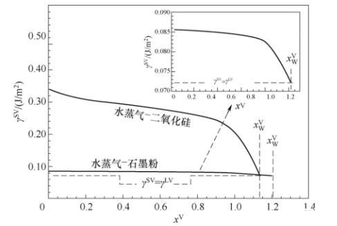 由團(tuán)簇分布可知,石墨和二氧化硅的潤(rùn)濕壓比分別為1.20和1.14。對(duì)于吸附質(zhì)水蒸氣,氣液界面張力γLV為0.0724 J/m2,因此,由式(4)計(jì)算得到的石墨和二氧化硅表面張力分別為0.086 J/m2和0.342 J/m2,與文獻(xiàn)中所報(bào)道石墨的表面張力值吻合較好,誤差為2.4%。將已得到的γS0值代入式(2),可繪制氣固界面張力γSV隨壓比的變化曲線,如圖1所示,隨著界面吸附量的逐漸增加,界面能逐漸減小,氣固界面張力不斷降低,直至形成固液界面。