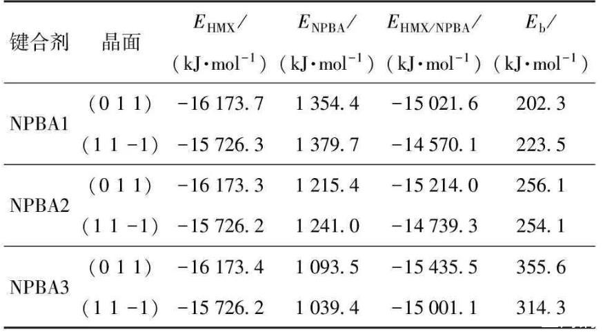 結合能是表征混合體系組分間相互作用力強度的特征參數,HMX吸附NPBA界面模型的結合能越大,表明界面間的相互作用越強。結合能Eb=(EHMX+ENPBA)-EHMX/NPBA,其中EHMX、ENPBA和EHMX/NPBA分別為界面模型中HMX晶面、NPBA以及界面模型的平均單點能。6種界面模型結合能的模擬計算結果見表2.