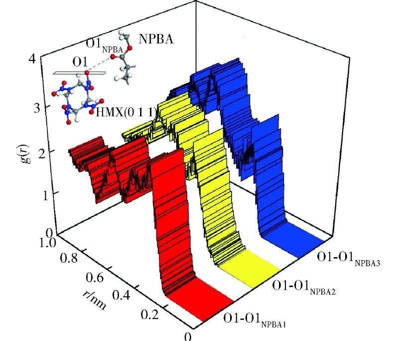 由于體系的原子種類較多,考慮到篇幅因素,且相對于氮原子,—NO2基團中氧原子與其他極性分子間的作用力更強,為此僅選取了HMX(0 1 1)晶面上—NO2基團中氧原子,對其與NPBA分子基團上極性原子間的徑向分布函數進行了計算,并根據徑向分布函數曲線峰的位置和高低判斷原子間的作用力類型和強弱。