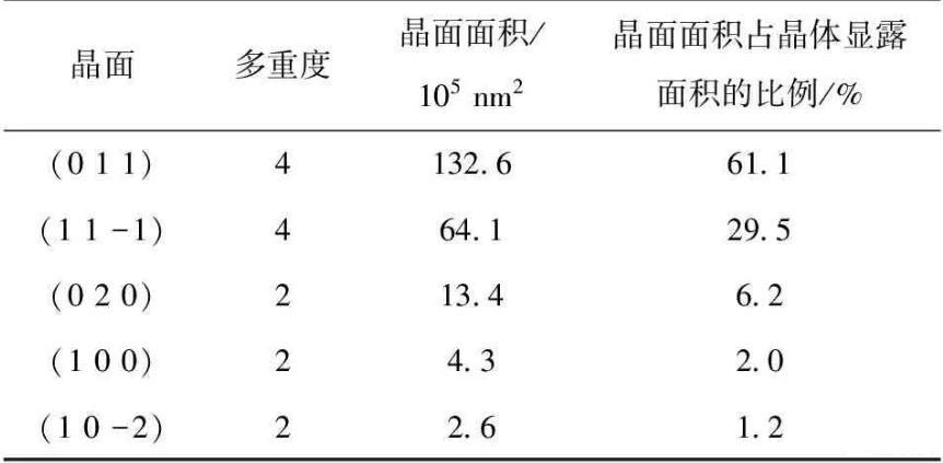由于HMX以晶體形式存在,因此建立HMX吸附NPBA界面模型前,需先確定與NPBA分子產生作用的具體晶面。為此,選用與實驗結果吻合較好的Growth Morpholog方法,計算得到了HMX的晶體形貌,為棱柱狀晶體(見圖2),其主要晶面及參數見表1.