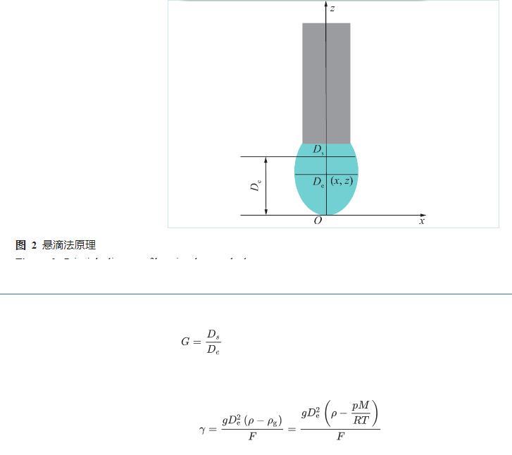 筆者采用懸滴法進(jìn)行水與瓦斯之間表面張力的測試,當(dāng)水滴被靜止懸掛在毛細(xì)管的管口處時,液滴的外形主要取決于重力和表面張力的平衡,通過對水滴外形的測定獲得水與瓦斯之間表面張力計算的相關(guān)參數(shù)。懸滴法原理圖如圖2所示,采用自開發(fā)的水與瓦斯之間界面張力分析軟件獲得式(1)中Ds、De,聯(lián)合水、瓦斯的密度、修正后的形狀因子(F)、重力加速度(g),基于式(2)計算水與瓦斯之間的表面張力。