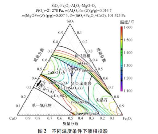 采用Factsage 6.4中“Equilib”模塊對(duì)不同堿度條件下的理論液相生成溫度以及不同溫度下的液相生成量進(jìn)行計(jì)算,結(jié)果如表7所示。在不同堿度條件下,燒結(jié)礦的液相生成量隨溫度的變化如圖1所示。通過“Phase Diagram”模塊計(jì)算SiO?-CaO-Fe?O?體系:氧分壓固定為21278 Pa,Al?O?組元固定為1.47%,MgO組元固定為0.73%情況下的液相投影,溫度區(qū)間設(shè)置為1100~1600℃,升溫梯度為50℃,計(jì)算結(jié)果如圖2所示(圖中s、s2、s4、s6代表同種物質(zhì)的不同晶體結(jié)構(gòu))。