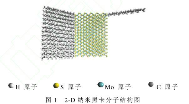 2-D納米黑卡具有雙層結構,由大小為30?×40?×12?的二硫化鉬納米片與直鏈烷烴構成。假設理想狀態(tài)下二硫化鉬納米片無晶格缺陷,其活性位點位置確定可參見文獻,且全部被C18H38直鏈烷烴接枝,如圖1所示。