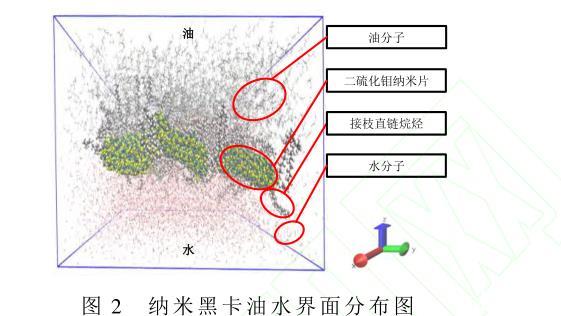 計算水分子、油相分子和納米黑卡之間的相互作用,截斷半徑分別為10?和12?。所構建的油水界面體系由31 500個油分子和17693個水分子組成,并將納米黑卡置于所構建的油水界面體系中。如圖2所示,油水界面上層部分的碳氫鏈表示油分子,油水界面下層區(qū)域代表水分子。