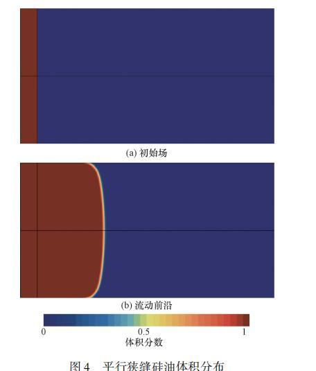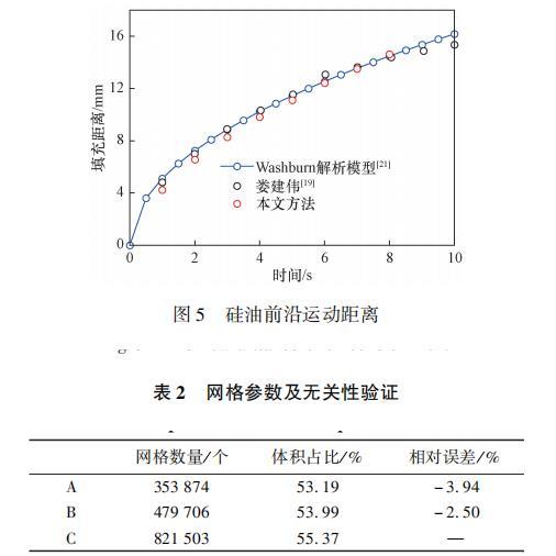 根據式(6)與式(7)可以看出,這類由表面張力驅動的流動與邊界處接觸角緊密相關。為保證接觸角施加方法的正確性,對表面張力驅動下的平行平板流動進行了計算,并將結果與前人的數值模擬結果進行了對比。驗證模型為15mm×8mm×0.4mm的平行平板,所采用材料為硅油,具體物性參數如表1所示。首先將平板前端部分區域內充滿硅油,以此為初始場進行計算[圖4(a)]。圖4(b)為計算一段時間后得到的流動前沿,最終得到的前沿最大高度隨時間變化如圖5所示,計算結果與前人數值模擬結果及Washburn解析模型吻合良好,證明了基于VOF模型的數值方法計算硅油填充平板過程的準確性。