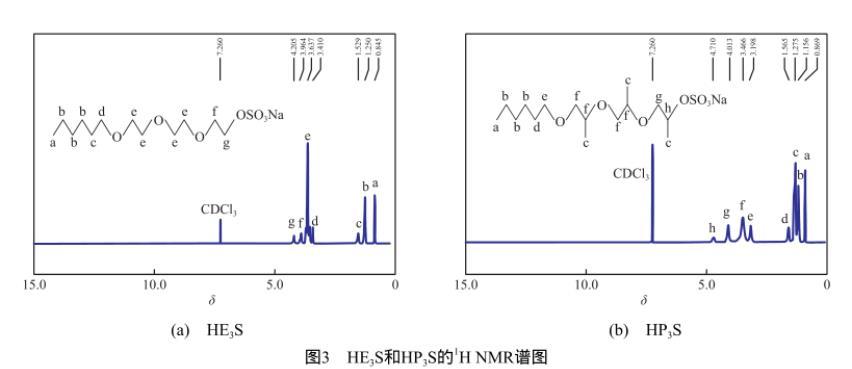 圖3為HE3S和HP3S的1H NMR譜圖。由于在合成過程中HE3和HP3為混合物,氫原子的化學(xué)位移(δ)會(huì)發(fā)生堆積,只能通過積分面積與δ確定特征基團(tuán)的氫原子個(gè)數(shù),而不能確定其裂峰[11]。由圖3(a)可知,δ=0.845(3H,—CH3),1.250(6H,—CH2—),1.529(2H,—CH2—),3.410(2H,—CH2O—),3.637(8H,—OCH2CH2O—),3.964(2H,—OCH2—),4.205(2H,—CH2OSO3Na),7.260(CDCl3)。由圖3(b)可知,δ=0.869(3H,—CH3),1.156(6H,—CH2—),1.275(9H,—CH3),1.565(2H,—CH2—),3.198(2H,—CH2O—),3.466(6H,—OCH2CH—O—),4.0 1 3(2 H,—O C H2—),4.7 1 0(1H,—CH—OSO3Na),7.260(CDCl3)。