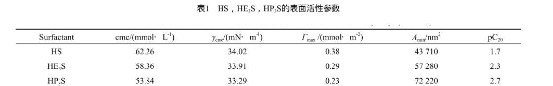 由圖4中的γ-c曲線按照文獻計算方法,可以求得3種表面活性劑的cmc、γcmc、pC20(其物理意義為使得溶液表面張力降低20 mN/m時的表面活性劑濃度的負對數)、平衡吸附量(Гcmc)和水化分子截面積(Amin),其具體數值列于表1。由表1可看出,相比于HS,HE3S和HP3S由于烷氧基團的插入,導致極性頭基的體積變大,在溶液中的排列變分散,從而在一定程度上降低了表面活性劑的cmc和γcmc。另外在親水基團和疏水鏈之間嵌入烷氧基團,而且烷氧基團呈卷曲狀結構,這兩個因素都導致Гcmc降低,Amin增大。Dahanayake等提出了參數pC20,用以表示表面活性劑的吸附效率,pC20值越大,吸附效率越高。由表1還可看出,烷氧基團的嵌入可顯著增加其吸附效率,這與分子結構決定的HLB值具有密切關系。