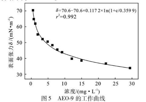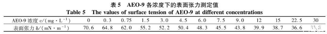 脂肪醇聚氧乙烯醚(AEO-9)是一種非離子表面活性劑,該類表面活性劑是非離子表面活性劑中發(fā)展最快、用量最大的品種。AEO-9試樣的表面張力測(cè)定結(jié)果見表5。
