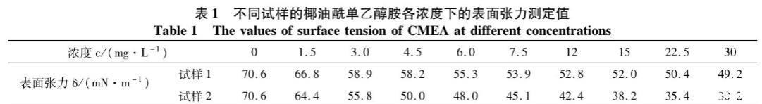 椰油酰單乙醇胺溶液的表面張力測(cè)定結(jié)果見表1。