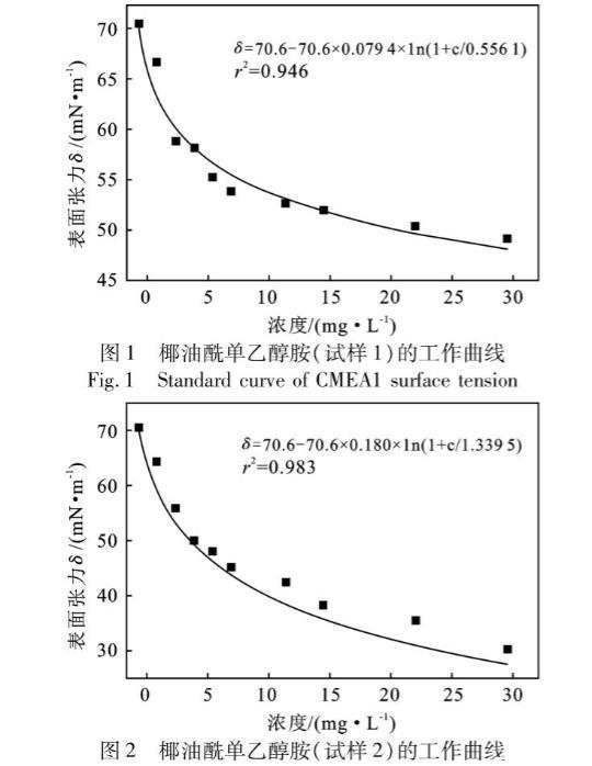 表1不同試樣的椰油酰單乙醇胺各濃度下的表面張力測(cè)定值