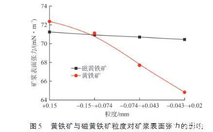 圖5黃鐵礦與磁黃鐵礦粒度對(duì)礦漿表面張力的影響