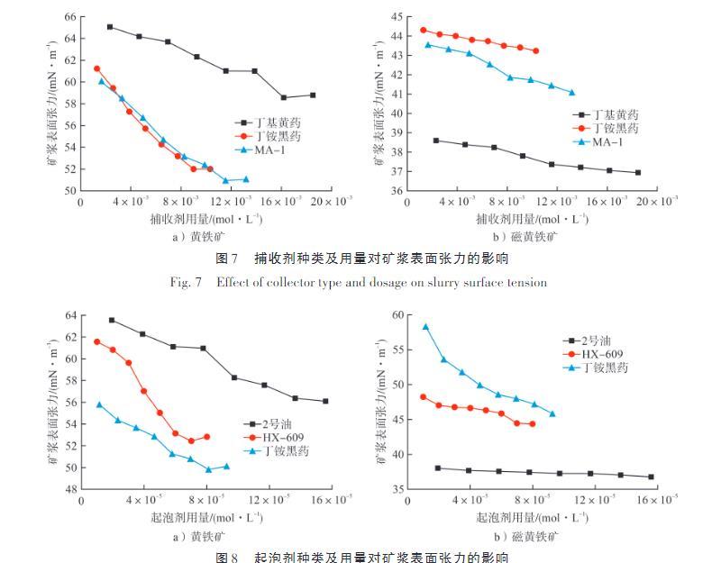 為研究捕收劑種類及用量對(duì)礦漿表面張力的影響,將黃鐵礦與磁黃鐵礦配成30%濃度的礦漿,起泡劑2號(hào)油用量3×10-5 mol/L、粒度-0.074 mm占比80%、pH=7,改變捕收劑種類及用量以測(cè)定礦漿表面張力,結(jié)果見如圖7。