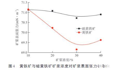 圖4黃鐵礦與磁黃鐵礦礦漿濃度對(duì)礦漿表面張力的影響