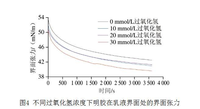 如圖3所示,乳液中油-水界面的明膠吸附率隨著過氧化氫濃度的增加而增加,從對照組的19.8%增加到30 mmol/L過氧化氫組的30.9%,增加1 倍左右,這表明更多氧化明膠分子吸附到油-水界面。Chen Jiahui等對肌原纖維蛋白進行超聲處理,發現超聲處理改變了肌原纖維蛋白的結構,從而有利于形成尺寸更小、更靈活的聚集體,促進蛋白質在油-水界面的吸附,減少油-水界面的界面張力。在米糠蛋白的氧化中也觀察到類似的現象。氧化導致米糠蛋白中暴露出更多的疏水基團,促進了蛋白質在油-水界面的吸附,形成黏彈性膜,降低界面張力,使液滴分裂成更小的尺寸。相似地,Zou Heinan等利用高強度超聲處理減小了貽貝肌漿蛋白的尺寸并增強了其表面疏水性,從而增加了蛋白質在油-水界面的吸附。